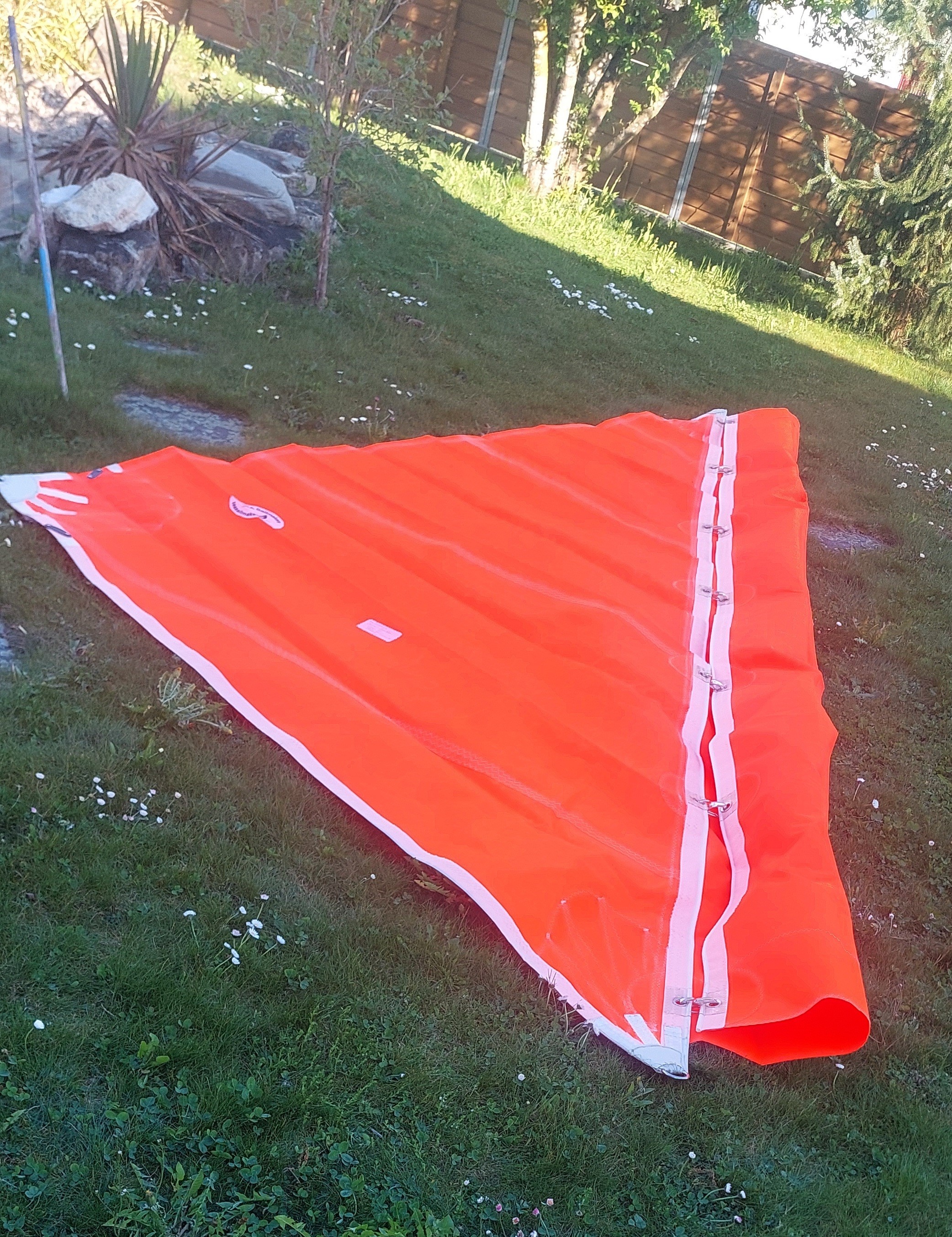 Dieses Segel ist klein und extrem stark. Gemacht für Winde ab 7-8 Bft aufwärts. HIer liegt es noch gemütlich zu Hause im Garten. Ist mir fast lieber so. Wenn ich es einsetzen muss, heisst das "chrampfe" bei Nässe, bei Kälte,bei hohen Wellen und mit Angst im Bauch.
