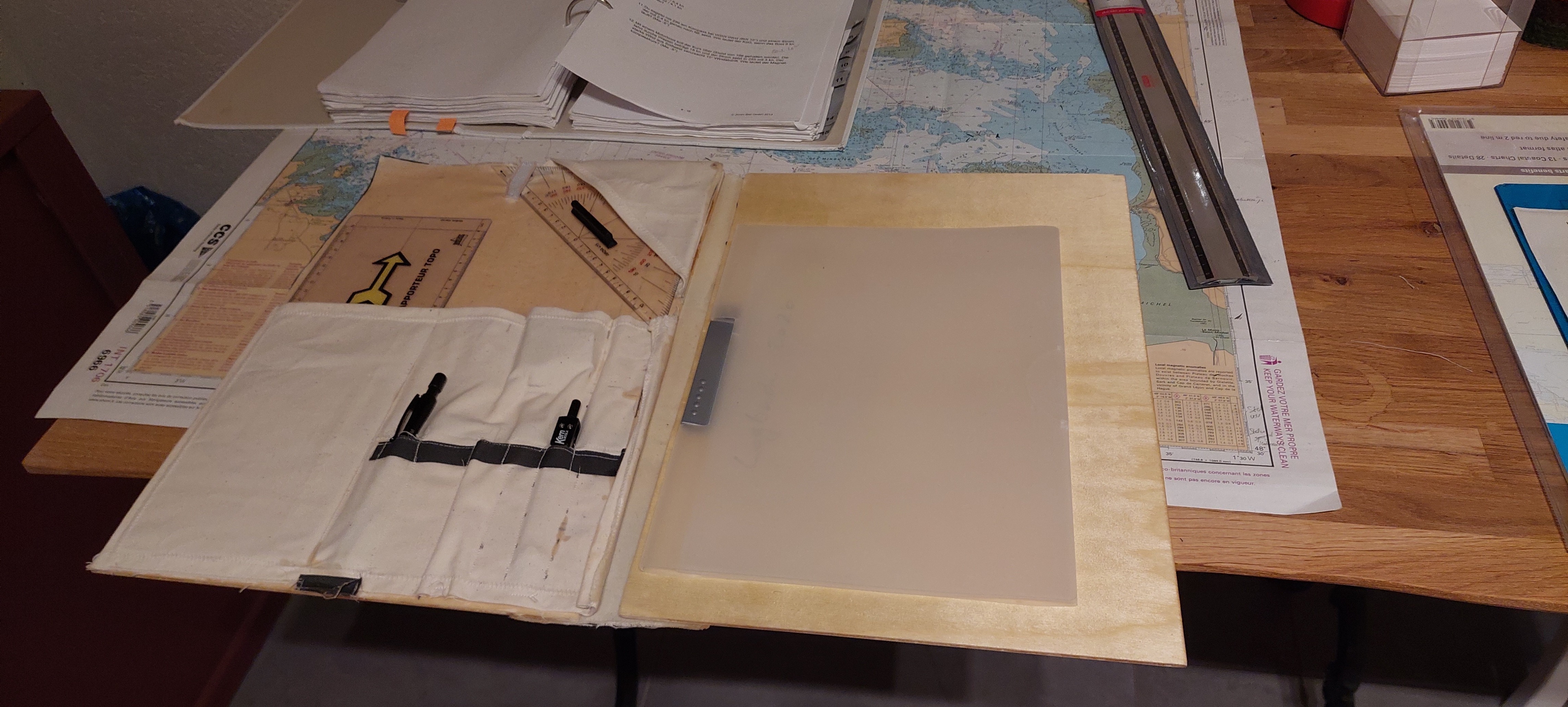 hier habe ich etwas gebastelt um mein Navigationsbesteck mit Logbuch und Karte in einer Mappe wind- und wetterfest versorgen zu können. Definitiv bin ich noch von der alten Schule:nebst der elektronischen Navigation werden weiterhin analog gepeilt und Standorte in der Karte eingetragen. Zu Hause übe ich auch wieder das Berechnen der Gezeiten, Wind und Stromabdrift u.s.w. Auch wenn das nicht gerade meine Stärke ist, hmmm.